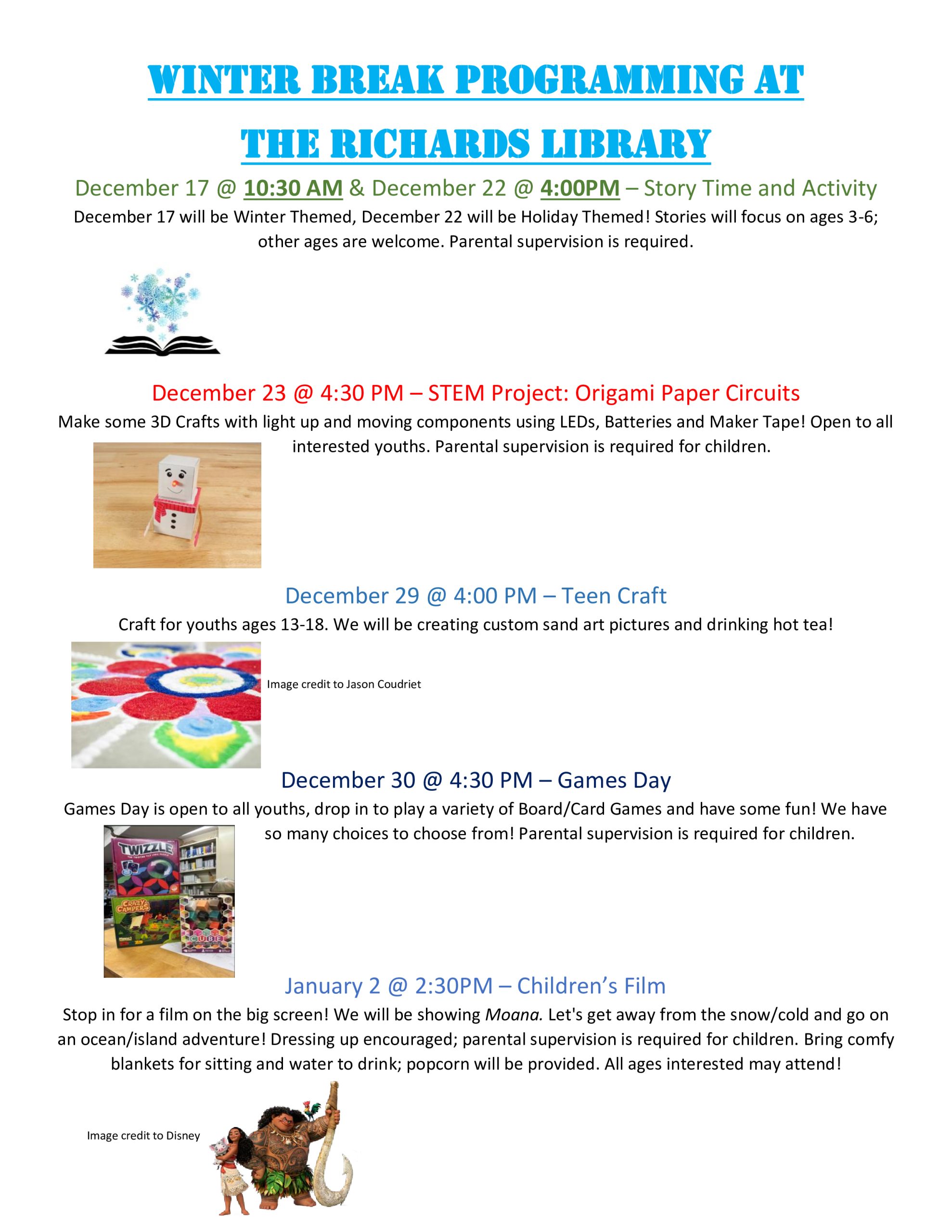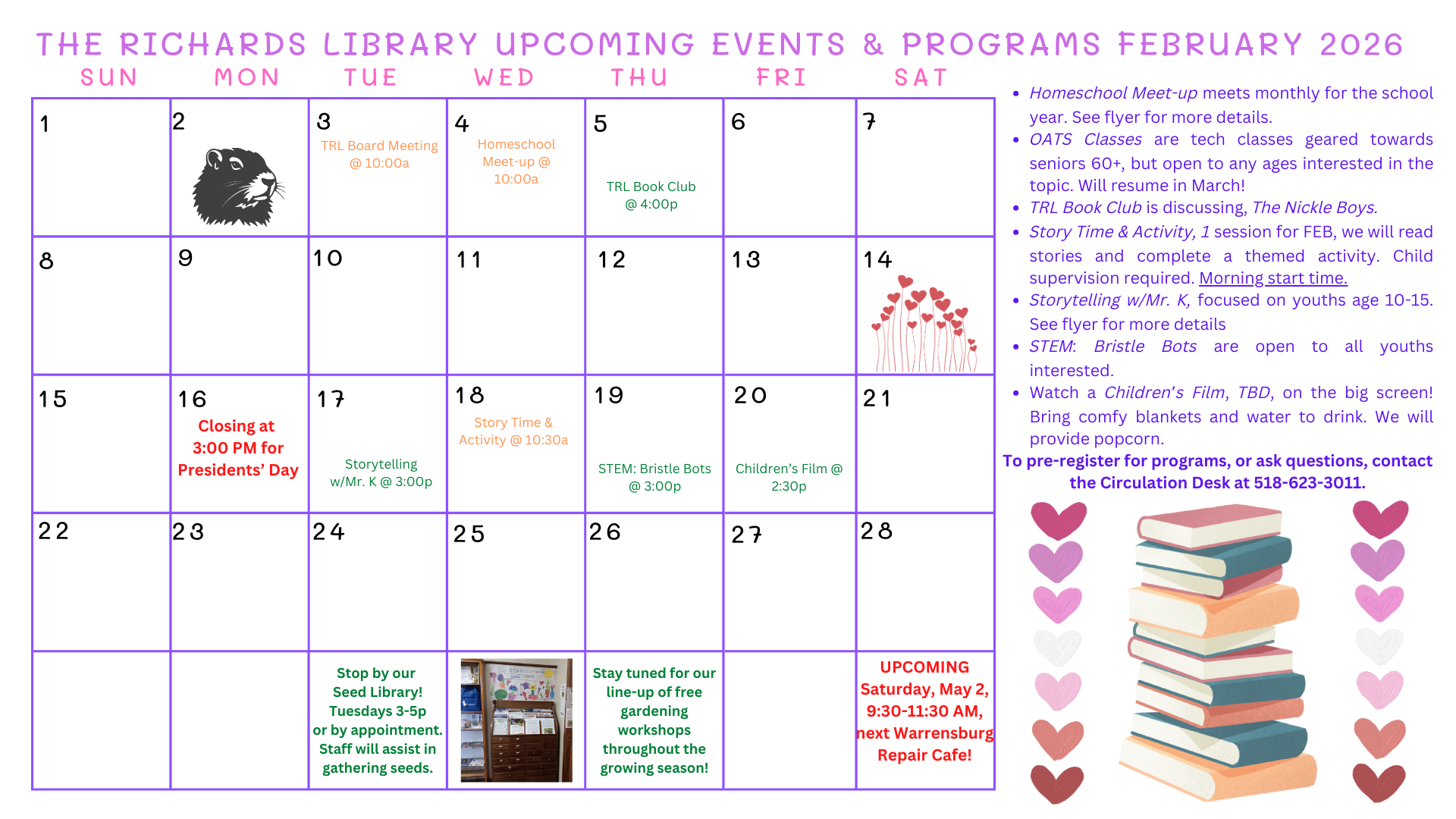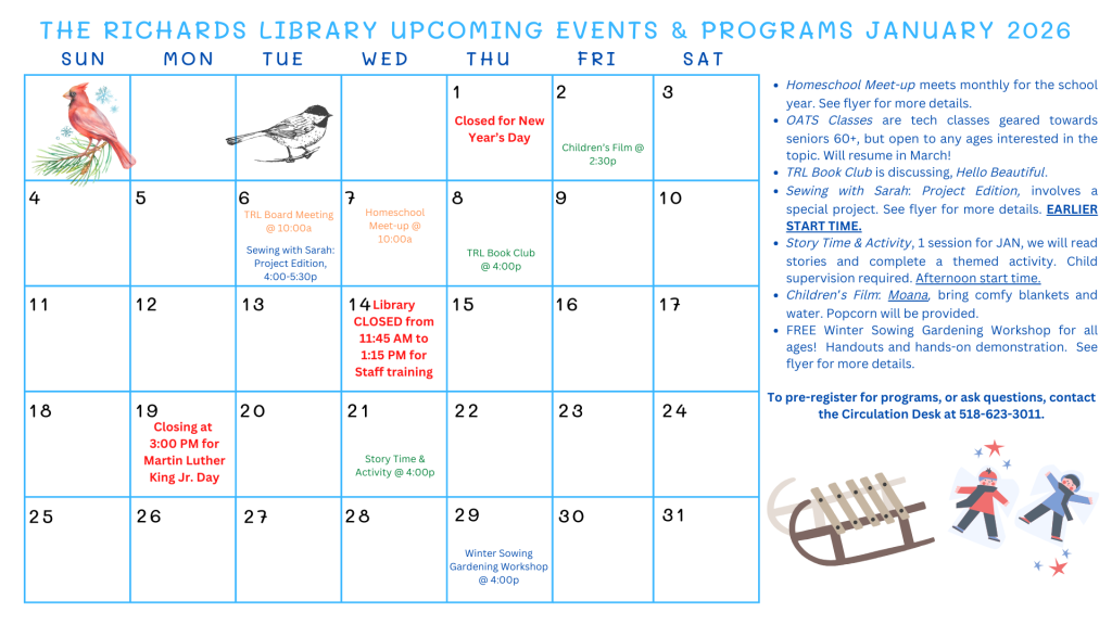 The Richards Library is collecting donations for one of our local food pantries. Shampoo, conditioner, and soap are also needed at the First Presbyterian Community Pantry. Even if you do not have fines, a credit could be applied to your account, or you can just donate. Thank you for supporting a local community resource this holiday season!